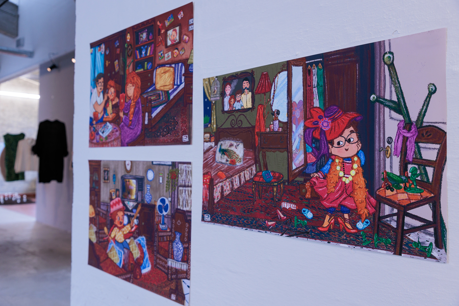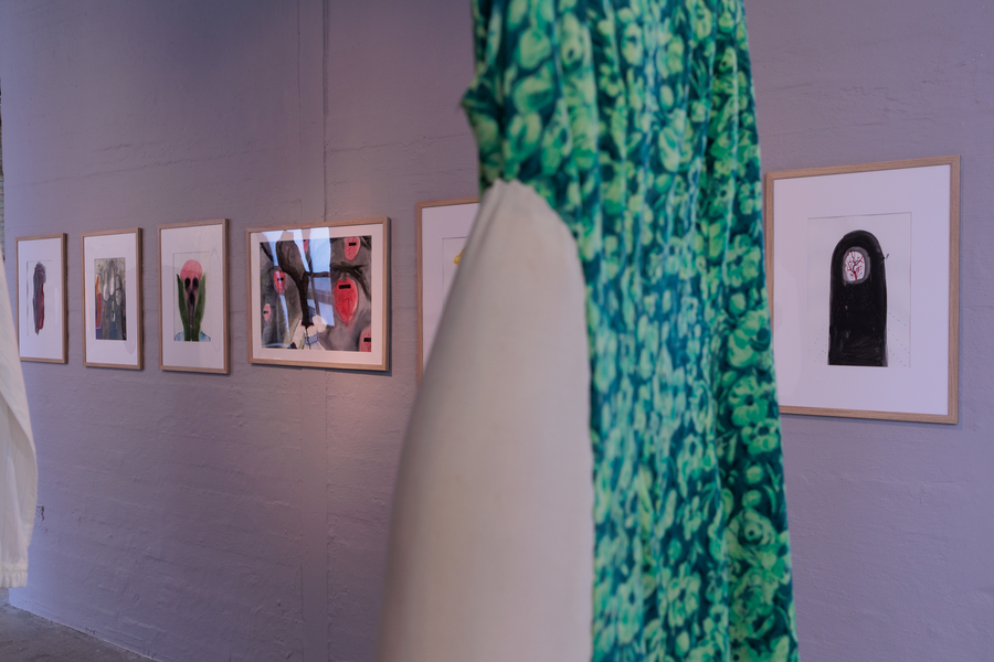 Some exhibition works delve into discourse about body conditions that exist on the fringes of societal and legal “norms” by transcending the conventional boundaries of gender and human anatomy. In her artistic practice, Gluklya often addresses vulnerability and inclusivity as political concepts by examining the societal roles imposed on women. Through her series of drawings and conceptual clothing titled Empowering Vulnerability (2006–2022), she offers a critical response to the society’s expectations of women by intervening into the qualities of niceness, perfection, balance, unwavering kindness, and perpetual silence traditionally prescribed to women by patriarchy. Some of the watercolors evoke the sensory shifts in our behavior during and after the COVID-19 pandemic, heightening our awareness of physical distance, touch, and our shared vulnerability. The installation by Noah Holtegaard and the drawings by Sara Khayat from her various series reflect on the artists’ own experience of queerness and its connection to mass visual culture. While Noah’s work presents the process of becoming a more fantastic version of himself, Sara’s illustrations capture the day-to-day routine of the characters of her series — from a girl who defies rigid gender roles to the young people of the LGBTIQ community in Damascus.