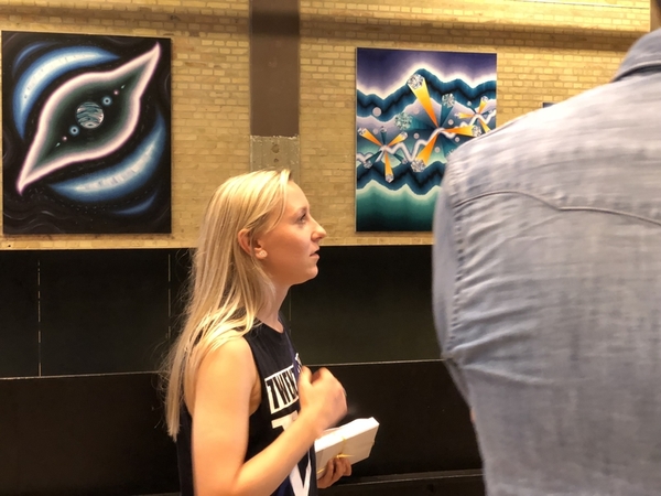 Inspired by the raw setting in Nordkraft, and the extreme height of TURBINEGALLERIET, Rebekka Borum has created a site specific and untraditional mounting that both challenges the viewer and the classical way of experiencing paintings.
